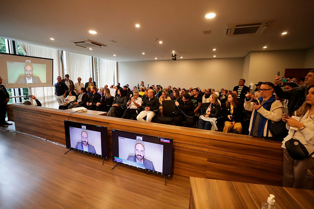 De forma online, o deputado federal licenciado Eduardo Bolsonaro (PL-SP) também participou do debate. “O mundo inteiro vem bater à porta da Casa Branca, vem buscar aqui nos Estados Unidos, um espaço para uma mesa de negociação, uma janela de oportunidade comercial, e no meio disso tudo, conseguimos ter sucesso em buscar espaço para o Brasil, para dizer que existe violação de direitos humanos no Brasil e uma democracia definhando”, disse ele que está vivendo atualmente em Washington DC, nos Estados Unidos. Para ele, “o Brasil não vive uma democracia saudável. Vive uma democracia disforme, que mais parece com uma ditadura”.