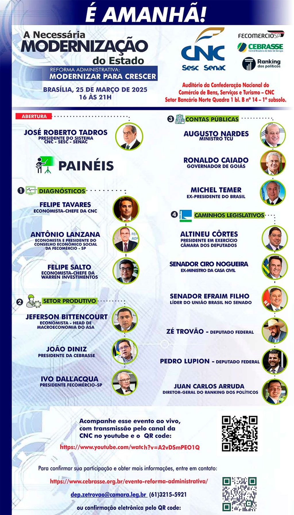 Brasília – Zé Trovão (PL-SC) convida parlamentares, autoridades e a sociedade civil para o evento sobre a Modernização do Estado, que será realizado nesta terça-feira, 25 de março, das 16h às 21h, no Auditório da Confederação Nacional do Comércio de Bens, Serviços e Turismo (CNC), em Brasília.