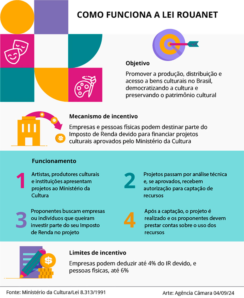 A Comissão de Integração Nacional e Desenvolvimento Regional da Câmara dos Deputados aprovou a proposta de aumento do limite de dedução do Imposto de Renda para doações a projetos culturais, conforme previsto na Lei Rouanet, direcionados a regiões impactadas por calamidades. O projeto de lei (PL 2017/24), de autoria do deputado Aureo Ribeiro (Solidariedade-RJ), dobra o limite atual de dedução, estabelecido em 6% para pessoas físicas e 4% para empresas, para doações em áreas afetadas por catástrofes naturais, com o intuito de fomentar a recuperação local.