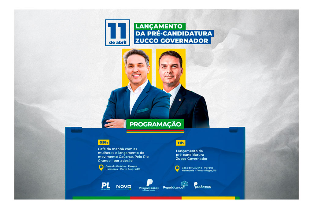 Evento em Porto Alegre terá a presença do pré-candidato à Presidência, Flávio Bolsonaro (PL-RJ) Rio Grande do Sul – O deputado federal Luciano Zucco (PL-RS) realizará, no próximo dia 11 de abril, o lançamento oficial de sua pré-candidatura ao Governo do Rio Grande do Sul. O ato contará com a presença do senador Flávio Bolsonaro